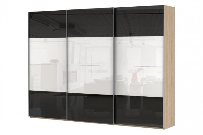 3-door wardrobe Comet 240×240 cm Bardolino oak, white and black glass facades