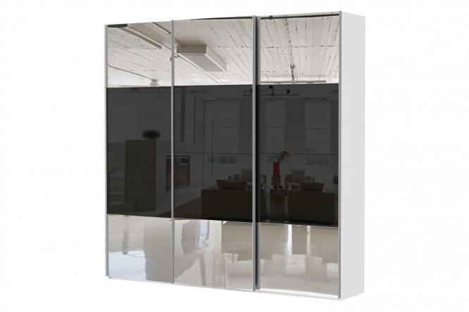3-door wardrobe Comet 240×240 cm white snow, black glass fronts, mirror