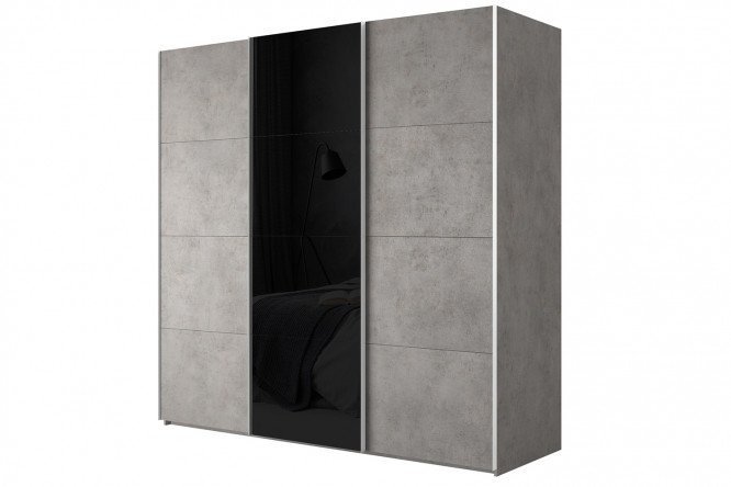 3-door wardrobe Comet 300×220 cm light concrete, black glass fronts, light concrete