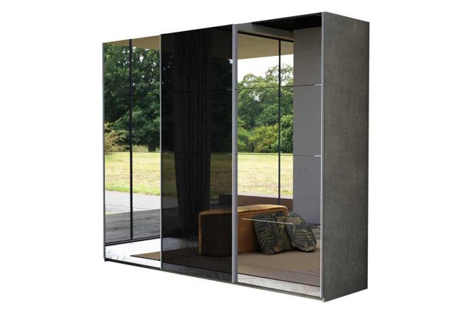 3-door wardrobe Comet 300×220 cm light concrete, mirror fronts, black glass