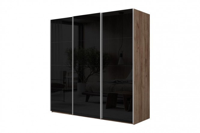 3-door wardrobe Comet 300×240 cm kraft tobacco oak, black glass fronts