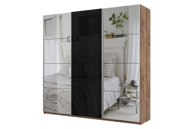 3-door wardrobe Cors 180×230 cm, craft tobacco oak, black facade, with two mirrors