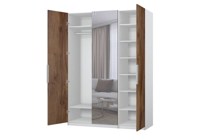 You can select and combine not only the internal contents, but also the external finishing options, which provides complete scope for creating a personalized design. Full-length mirrors, facades in white or wood decor, front fittings – the final say remains with the buyer.