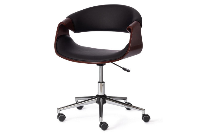 The elegant and reliable BEND chair from the OFFICE collection is an indicator of the impeccable taste of its owner. This unique model will fit perfectly into the design of an office or home. The wooden frame made of veneered plywood and faux leather upholstery are a successful combination of reliability and elegance. Faux leather is hypoallergenic, wear-resistant and easy to care for. The seat with a soft filling made of standard density polyurethane foam allows air to pass through, does not accumulate dust, and does not deform for a long time. To achieve a comfortable position, the chair is height adjustable. Wooden armrests of an unusual shape will help reduce discomfort in the shoulders and neck during long-term work, and also help you sit comfortably at the table. A chrome-plated metal cross with a diameter of 640 mm ensures the stability and safety of the model. The combination of a walnut frame with a black seat and back looks attractive and aesthetically pleasing. The presence of high-quality polyamide casters makes it easy to move around on the chair without even getting up from it. The wheels are suitable for use on low-pile carpets and special protective surfaces. The BEND model is distinguished by increased comfort and a presentable appearance; it will surprise the owner with its durability and reliability. The maximum load of the chair is 120 kg. The chair is delivered unassembled. Assembly instructions included.