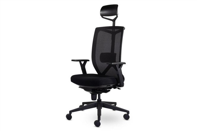 The main feature of the chair is adjustable plastic lumbar support and armrests adjustable in height and width. The backrest is covered with durable mesh, the seat is upholstered in nylon fabric, and the filling is high-density polyurethane foam. The headrest ensures a comfortable head position.