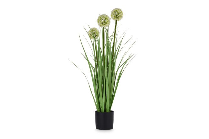 The easiest way to fill the interior with the breath of nature is with the help of floral decor. And from the point of view of rationality, an excellent choice would be the artificial Allium plant, which does not require regular watering and complex care. The tall stems are decorated with recognizable spherical inflorescences consisting of many small star-shaped flowers. Living allium, also called decorative onion, is very beautiful, but it is rarely grown indoors due to its strong aroma – the imitation does not have this drawback. You don’t even have to pick up a vase or flowerpot – the flower arrangement is complemented by a black plastic pot.
