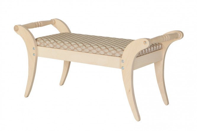 The Tiffany banquette will fit in at the foot of the bed in the bedroom, near the dressing table in the boudoir, or in the hall. The legs of the model are made of solid birch, the drawers are finished with natural veneer. The graceful outlines of the frame emphasize the natural beauty of the tree. The curved supports are connected by turned elements and form handrails that you can lean on when standing up. The softness of the seat is provided by a filling made of foam rubber and padding polyester. The upholstery is made of jacquard fabric, matched to the wooden details.