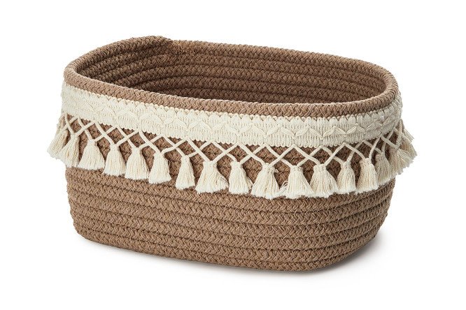 Basket 601140 is an example of the optimal combination of functionality and decorative qualities. You can find a use for the accessory in any room – from the bedroom and living room to the balcony and hallway. Various small items that often get lost will find their place in the container: toys, remote controls, wired headsets, knitting needles and knitting threads. In the bathroom, the basket can be used for folding guest towels, in the nursery – for storing pajamas. A border with tassels is sewn along the upper edge of the product. Polycotton cord is distinguished by high strength and wear resistance; it does not shrink or deform.