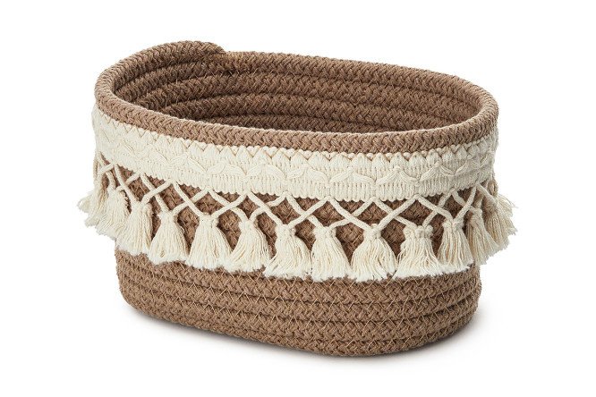 Basket 601140 is an example of the optimal combination of functionality and decorative qualities. You can find a use for the accessory in any room – from the bedroom and living room to the balcony and hallway. Various small items that often get lost will find their place in the container: toys, remote controls, wired headsets, knitting needles and knitting threads. In the bathroom, the basket can be used for folding guest towels, in the nursery – for storing pajamas. A border with tassels is sewn along the upper edge of the product. Polycotton cord is distinguished by high strength and wear resistance; it does not shrink or deform.