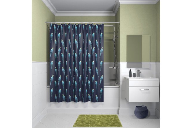 Bright opaque curtain with a stylish print with turquoise parrots on a dark blue background. The curtain is made of polyester with a beautiful satin texture and delicate shine. The curtain has chrome-plated metal eyelets; 12 clear rings included, “O” shape