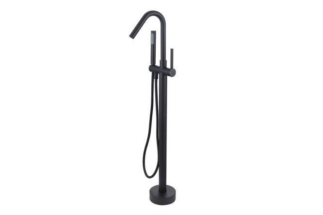 Black single-lever brass floor-standing faucet BOND Circle B05-4988 for bath or shower with swivel spout is the perfect addition to the interior of a modern bathroom. A comfortable long handle that follows the shape of the spout allows you to easily control the water flow. The built-in aerator helps save water, saturates it with air bubbles and makes the stream soft, preventing splashing. It reduces water noise, accelerates the removal of chlorine, and also filters debris particles, trapping them on the mesh. The aerator is easy to maintain – thanks to a special recess, it is easy to unscrew and clean. The set includes a hose and a stylish hand shower, conveniently fixed on the holder.