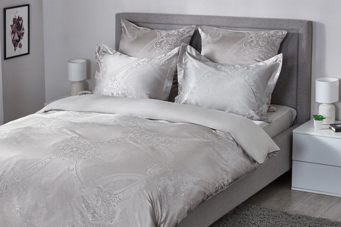 The elegant ESTUDI BLANCO Isabelia bedding set attracts attention with its sophisticated combination of shiny satin linen and matte natural cotton. An effective design solution will make the interior of a classic bedroom more expressive and sophisticated. Complex relief patterns on the surface, formed by jacquard weaving of threads, look noble and elegant. This truly royal linen is incredibly soft and very pleasant to touch. The set will serve you faithfully for many years, remaining just as beautiful and comfortable.