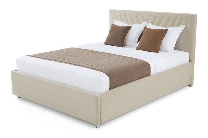 Victori – the bed is comfortable and elegant. Its frame is made of strong and durable chipboard, the upholstery is made of soft velvety velor. The high soft back of the headboard attracts attention: the stitching in the form of diagonal lines forming a V in the center looks original and impressive.