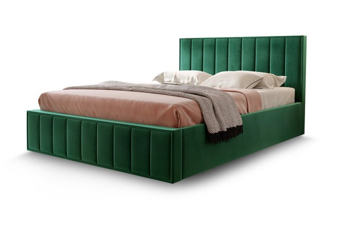 The Vienna bed is the basis for creating a comfortable sleeping place. The set includes a reliable mattress base with a convenient lifting mechanism and a linen box. The high back provides a comfortable support while having breakfast or reading in bed. The frame is upholstered in velor, which is tactilely pleasant and shimmers effectively in the rays of light. The footboard and headboard are decorated with stitching in the form of a series of vertical stripes.
