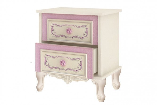 The Marquise bedside table is part of the furniture collection of the same name for a girl’s or teenage girl’s room. The model is designed in the same style as other items and will be an excellent addition to a bed with a figured headboard. Two drawers have enough space for children’s cosmetics, jewelry, and hair accessories. On the tabletop you can place a night light, a photo of the owner of the room, or a favorite toy. The delicate color scheme is inspired by the Provence style: lavender facades with a crackle effect are decorated with MDF overlays with a subtle pattern and handles in the shape of a rosebud.