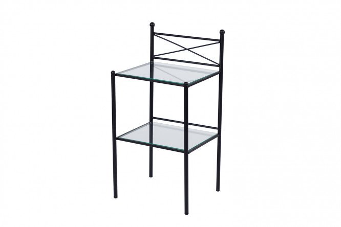 The cabinet IP 543-04 will organically complement a bed with a metal frame or forging elements. The model has the shape of an open bookcase and serves an aesthetic rather than a utilitarian function. The all-metal back is decorated with a decorative element and is connected to the front posts by jumpers that hold shelves made of tinted transparent glass. The frame is painted with black polymer paint with a moire effect. All racks are equipped with injury-proof rounded tops; supports with plastic plugs will not damage the floor covering