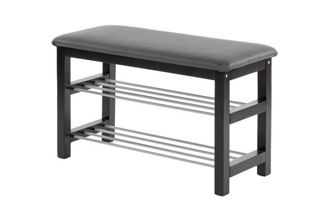 Sitting on such a bench, it is convenient to change shoes. Under the soft seat, trimmed with eco-leather, there are two metal lattice shelves for storing home and casual shoes.