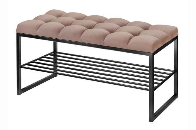 “The RUBY MINI bench with a black base, a shelf for shoes and a soft seat in a carriage screed attracts attention with its laconic appearance and comfortable fit. The frame of the bench is made of steel profile pipe 20×20 mm. The metal base with a matte polymer coating is highly durable and scratch-resistant. For storage, there is a metal shelf where you can put 4 pairs of shoes. The legs of the bench have felt pads to protect the floor covering. The bench can accommodate 2 people, the maximum load on the bench is 120 kg. High-quality powder paint is used for steel processing. Modern Greenween production guarantees the reliability and aesthetics of the welded seams of the metal furniture. The upholstery of the cushion is made of artificial velor, a soft, dense and wear-resistant material. Velvety microfiber fabric has pleasant tactile properties and is resistant to stains.