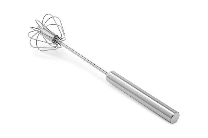 The stylish silver whisk is easy to care for and use: by periodically pressing the handle, the blades rotate and effectively whip the liquid. The process does not require much effort, the work is done easily and quickly: it will take literally a few seconds to prepare an omelette.