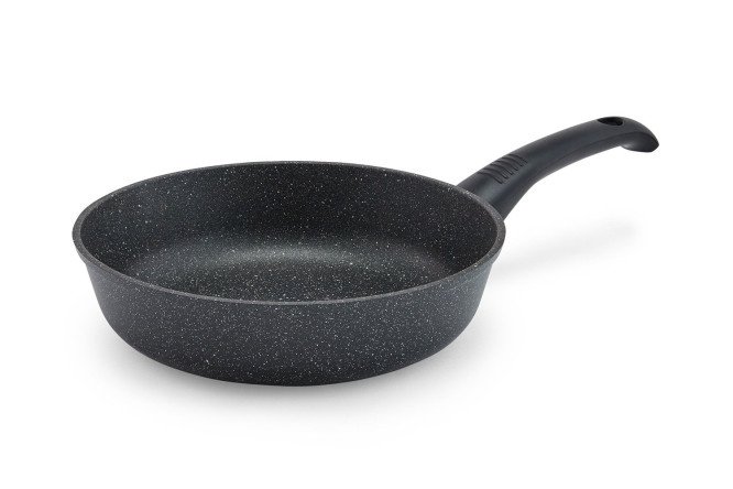 The BERKRAFT Nord frying pan with high sides can be used for frying and stewing various dishes. It is lighter than cast iron cookware and does not deform when exposed to high temperatures. The inner surface of the frying pan is coated with a five-layer non-stick GMM DURASLATE coating, which is abrasion-resistant. During frying, food does not stick to the walls and bottom, and you can cook almost without oil. The patented coating does not emit harmful components when heated. The ergonomically shaped handle with a bakelite lining does not heat up and allows you to remove a hot frying pan from the stove without using oven mitts, without fear of burns.