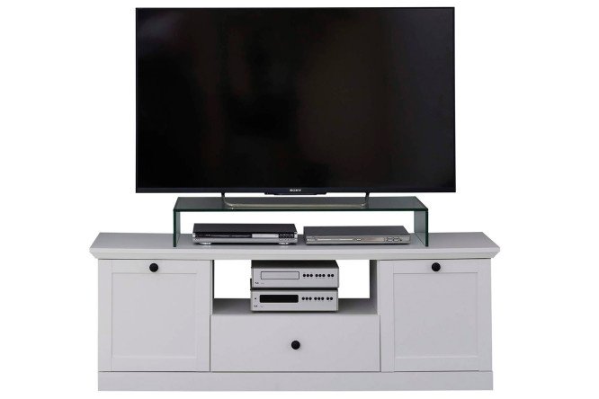 The cabinet is made in an elegant, discreet style. It is very decorated with a snow-white coating, emphasized by contrasting handles, framed facades and a lid in the form of a cornice. The product, 138 cm wide, is suitable for a large-diameter TV and will help you create a stylish and comfortable TV area.