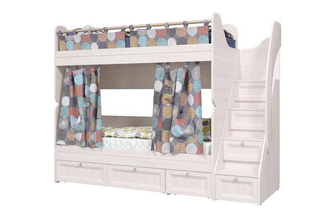 The Bounty bunk bed will make the children’s room shared by two owners more spacious and not overloaded with furniture. Under the lower berth there are 2 drawers, in which it is convenient to store bedding, toys, and sports equipment. The steps of the side staircase simultaneously serve as a storage system. A staircase with a rounded handrail can be located on either side. The upper tier is equipped with a safety rail in the form of a thick bar with textile stops. Additional coziness of the lower bed will be provided by jacquard curtains specially designed for the collection with pockets for small items. The set of curtains is not included in the set, you can purchase it separately.