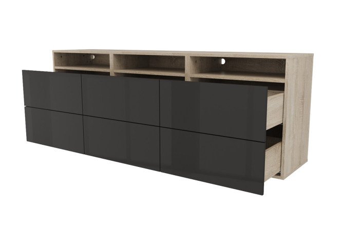 Cabinet 3 shelves and 6 drawers Oscar Amika 180×64 with closers, Sonoma oak / glossy black graphite