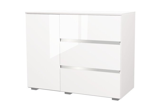 Linda’s chest of drawers combines practicality and spectacular appearance. The glossy surface of the facade reflects the surrounding environment, thereby visually expanding the room. This effect is enhanced by mirror inserts between the drawers, thanks to which the model looks even more elegant. The chest of drawers is equipped with three drawers on ball guides and a hinged side section, which is divided into two equal parts. For safety, the product must be fixed to the wall. The product’s laconic design and elegant “snow white” shade will appeal to fans of minimalism in the interior.