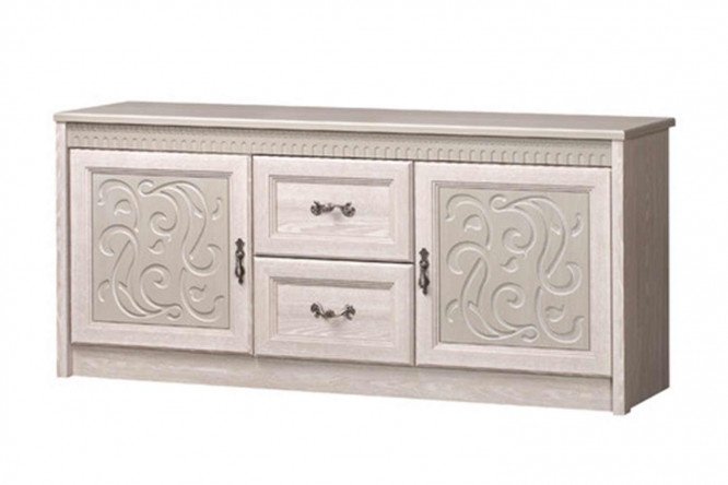 The Lucia cabinet is an excellent choice for fans of respectable classics. The combined module can rightly be called multi-purpose: its surface is suitable for installing a TV; in drawers and side sections with shelves it is convenient to store multimedia equipment, dishes, books, and table linens. In the design of the model, the classic theme is played out using various finishing methods: milled patterns on the facades, application of patina, and the use of antique gold tone front fittings.