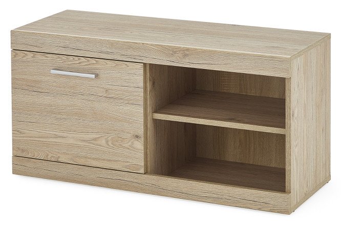 A compact low cabinet from the Oskar collection is suitable for storing shoes in a small hallway. The distinctive features of this model are its modern, laconic design and thoughtful functionality. The cabinet is equipped with a compartment closed by a hinged door and an open section with two convenient shelves. It is made of moisture-resistant, high-strength laminated chipboard and equipped with high-quality fittings that ensure comfortable operation. Despite its shallow depth, the product can hold up to 6 pairs of shoes.
