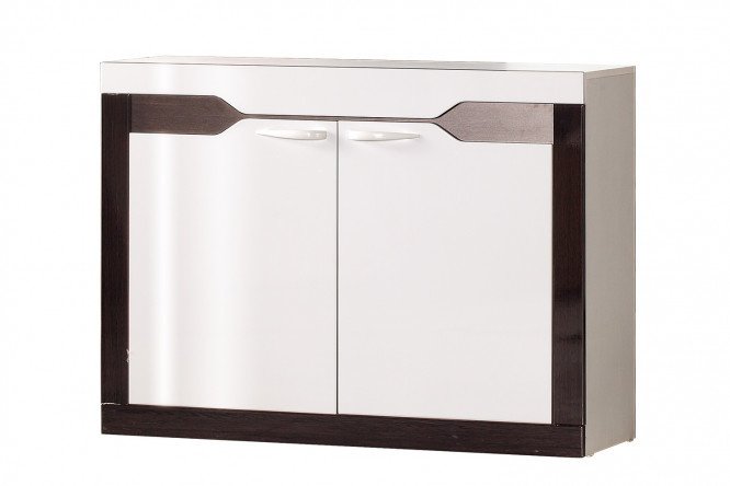 The Ronda cabinet has a multi-purpose purpose and can be used to organize storage in the hallway, living room or bedroom. Each compartment with a hinged door is equipped with a shelf: in the lower niche formed by it you can place taller winter shoes: ankle boots, UGG boots, hikers. The originality of the design is given by doors with a figured top, the shape of which is supported by a decorative overlay on the facade. The end plates are made in a wenge shade, creating an expressive contrast with the color of the body. White glossy handles complete the stylish look of the furniture.
