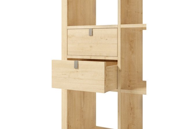 The product is made of tambourate – a light and durable modern material, which is a slab filled with honeycomb material. An insert with two drawers is an option with which you can complement the rack by covering either side with stylish and laconic drawers. Using the accessories presented in the RIDDLE catalog, create your own storage system by adding a shelving unit with: drawers, doors that open on either side, and a back wall. The Calgary BOX drawer insert fits any model of RIDDLE storage systems.