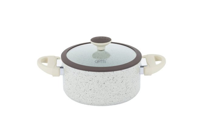 The Gipfel Sonrizo 0432 aluminum pan is made of forged aluminum, which makes it lightweight and yet quite durable. The non-stick ceramic coating Excilon is absolutely harmless to health and does not emit harmful substances when heated. The composition does not contain PTFE (polytetrafluoroethylene) and PFOA (perfluorooctanoic acid). The quality of the product is confirmed by international certificates. The pan is made in a delicate design, has a delicate beige color and is decorated with marble. The external decor, imitating marble inclusions, repeats its pattern on the ceramic non-stick coating inside the cookware, maintaining a harmonious, holistic perception. At the same time, the ceramic coating does not acquire the properties of marble. Ergonomic bakelite handles are also in light colors with a brown insert and Soft Touch coating (non-slip and comfortable to hold). Widely spaced bakelite handles do not heat up and eliminate the possibility of getting burned on the hot body of the pan. Casserole in branded packaging.