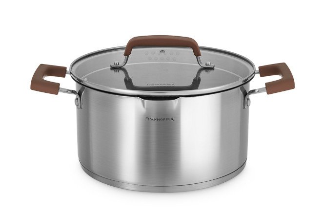 The VANHOPPER saucepan with a lid is not only convenient and practical, but also very attractive; cooking in it is a real pleasure. The cylindrical model is made of shiny steel, which is resistant to corrosion. The material is safe, does not emit harmful substances, does not absorb odors and is easy to clean.