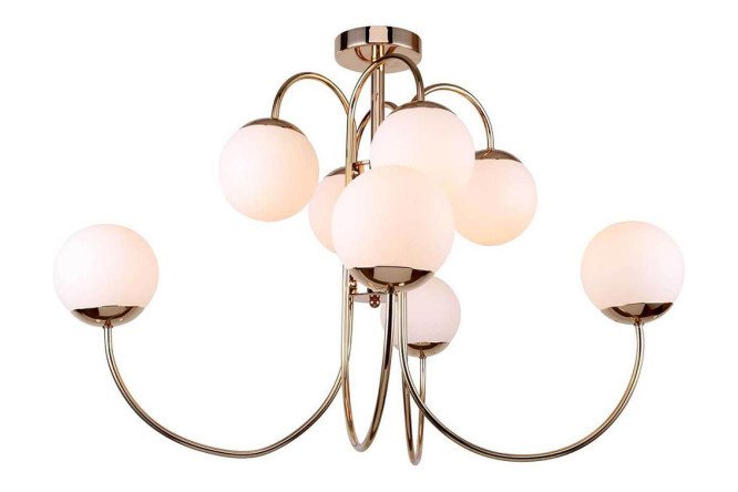 The STILFORT Miracle chandelier is an elegant model that will fill the room with soft light that is comfortable for the eyes. The fittings of the ceiling lamp are made of metal with a shiny galvanic coating. The brackets are gracefully curved and resemble the stems of an exotic plant, at the ends of which white spherical inflorescences “bloom.” Frosted glass shades, directed up and down, evenly scatter the rays of light.