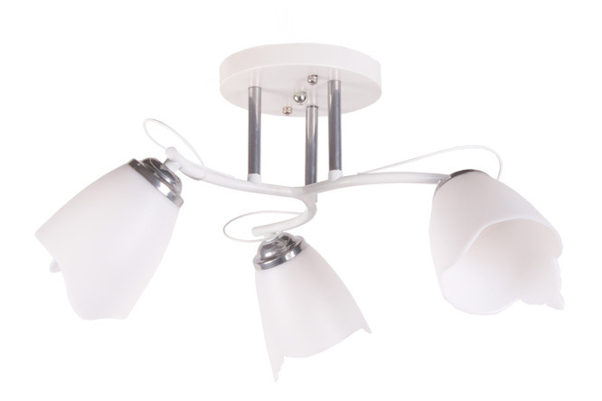 Ceiling lamp 1009/3 is perfect for creating a romantic mood in a classic interior and decorating a room in a modern style. The design of the model uses a spectacular combination of white lampshades in the shape of half-opened buds, mounted on gracefully curved white fittings, and chrome parts.
