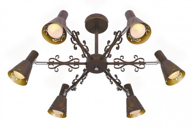 The eclectic design allows the Duncan ceiling lamp to be used in interiors of different styles: from modern and neoclassical to country and shabby chic. Decorative metal elements and golden patina give the chandelier an impressive look. Movable metal shades are decorated with a continuous floral pattern. Any light sources can be used; the general requirement for them is an E14 type base.