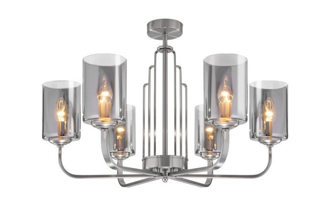 The Defi ceiling lamp will become a bright element of the interior, although it is made in subdued colors. The shade of the cylindrical glass shades echoes the color of the coating of the metal elements, so the switched-off chandelier does not catch the eye, despite the spectacular decorative element adorning the fittings. Everything changes when the lamp is turned on, and the lamps, clearly visible through the translucent glass, turn the chandelier into an art object.