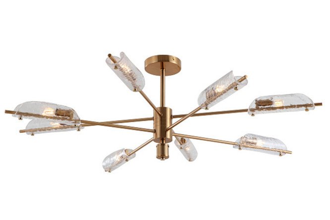 The special feature of the Baret series is its shades made of embossed glass with imitation embossing, creating a play of light and shadows for a striking visual effect. The brass color of the fittings and the petal shape of the lampshades evoke warm beauty.