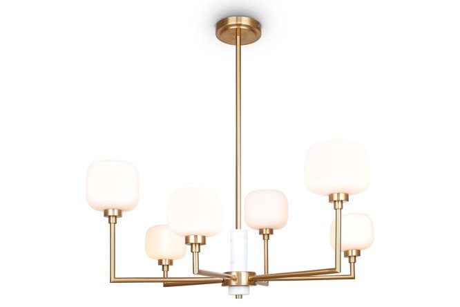 The FREYA Modern Tender ceiling lamp is an original model for basic interior lighting in a modern style. The design of the product organically combines right angles and rounded shapes, shiny metal and frosted glass. On a high thin stand there are brackets with lampshades in the shape of cubes with rounded corners; the junction of the beams is decorated with a white elongated insert.