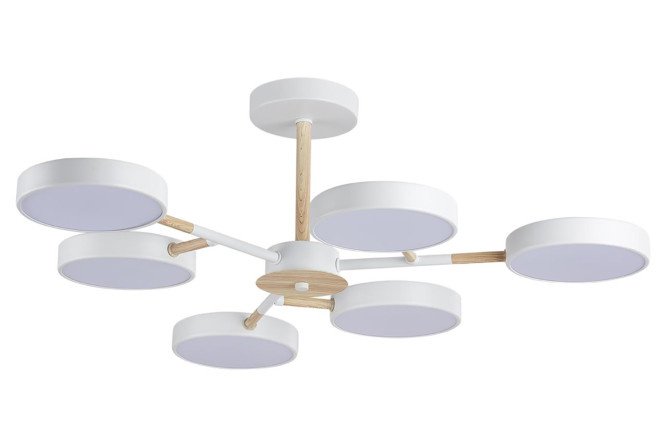 A snow-white chandelier with golden wood decor will decorate the interior in modern and classic styles. Thanks to the optimal size of the fittings, the lamp is suitable for a room with any ceiling height.
