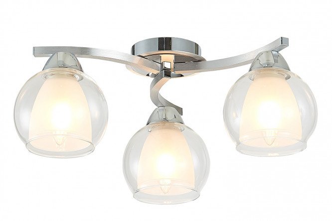 The Christie chandelier can be used for main lighting in a bedroom or living room, including in rooms with low ceilings. The visual lightness of the lamp is given by double shades directed downward: the inner bell-shaped diffuser is made of white frosted glass, the outer, spherical, is transparent. The chrome fittings are polished to a mirror smoothness: the rays reflected from its shiny surface create a soft pattern of light and shadow on the ceiling.
