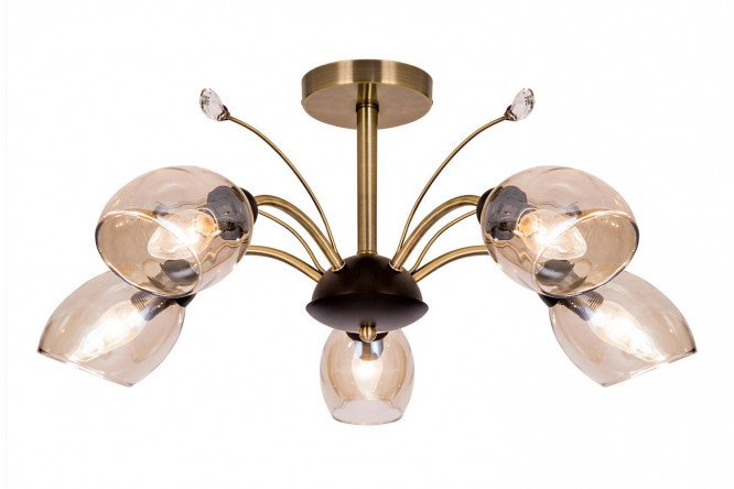 The silhouette of the magnificent Comet chandelier resembles the lights of a festive fireworks scattered in the night sky. The base of the device is made of durable metal with a bronze galvanic coating: the nobility of the shade is emphasized by dark chocolate elements. Asymmetrical glass shades are tinted in a champagne golden color. Faceted leaves made of transparent crystal harmoniously complete the composition. It is recommended to use incandescent lamps with a power of up to 40 W or LED lamps of any power as light sources.