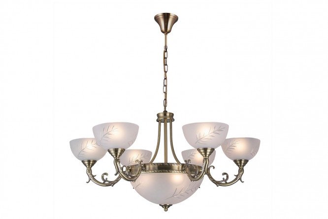 The classic Cremona chandelier captivates with its majestic silhouette and interesting color scheme. The metal base is galvanized in a noble bronze color. A wide hemisphere decorated with stylish ornaments in the center of the composition refers to ancient times. The lampshades are smaller copies of the central bowl and are decorated with a transparent floral pattern. They are made of frosted glass, which disperses the light flux evenly and softly. Cartridges made of high-quality carbon fiber allow the use of incandescent lamps with a power of up to 40 W or LED lamps without power restrictions in this model.