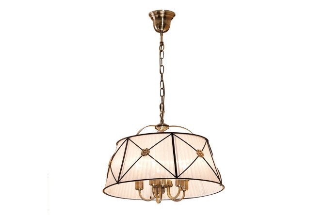The Dresden chandelier is a practical lighting fixture designed in a retro style. The design consists of a lampshade attached to the base using a chain. A lampshade made of corrugated textile is fixed inside a metal frame in the shape of a truncated cone. Metal rosettes-bouquets decorating the intersections of diagonal rods were used as decorative elements. The lamp will be a successful addition to interiors in the style of classicism and renaissance.