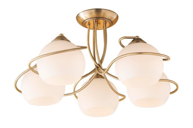 The Lima chandelier is attached to the ceiling and has a futuristic design in the form of metal stems encircling 5 round shades and twisting into a fancy knot in the center. Frosted glass lampshades provide diffused, pleasant light in a room up to 20 sq.m. A high degree of protection from dust and moisture will ensure the durability of the Lima chandelier.