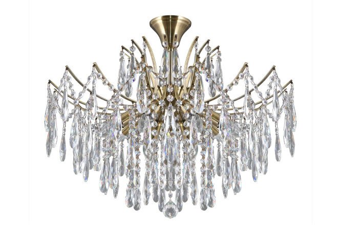 The elegant Selena chandelier will fill the room with a magical glow and festive shimmer. The model resembles an open bud of a precious fairy-tale flower. The metal base of the device is galvanized in the color of noble bronze. Decorative elements – sparkling graceful beads and almond-shaped drop pendants – form a mesmerizing crystal waterfall. A large faceted ball at the bottom gives the composition a complete look. The lamp will decorate the interior of a room decorated in a classical or neoclassical style.