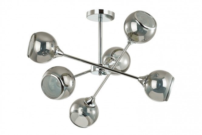 The Comfi Sandra chandelier attracts attention with its incredible brilliance and ultra-modern design. The model is made of glass and chromed metal. Its highlight is its unusual asymmetrical frame, consisting of horn-rays attached to a round base. On each beam, on both sides, there are lampshades in the form of truncated balls made of smoky glass with a mirror shine. Slightly darkened lampshades softly diffuse the light and create a cozy atmosphere in the room. By connecting a dimmer to the chandelier, you can control the brightness of the lighting.