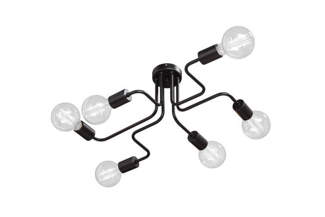 The Amigo 6 ceiling chandelier is an ideal lighting source in a room with low ceilings. It is made in a loft style, but can perfectly complement interiors of various styles. Designed for 6 lamps with a power of 40W for effective lighting of 18 m² of premises. The chandelier is attached to the ceiling using a strip and has an E27 base type. Metal was used to make the base of the lamp. Bulbs are not included, please be sure to purchase them.
