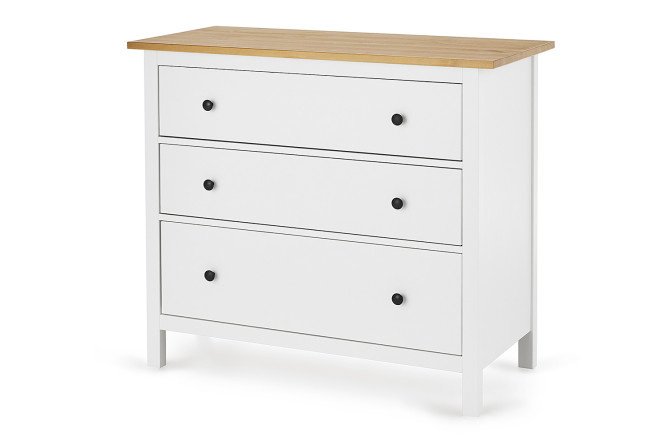 The chest of drawers has three drawers on roller guides, which are not painted white on the inside like the fronts of the chest of drawers, which gives them a natural look.